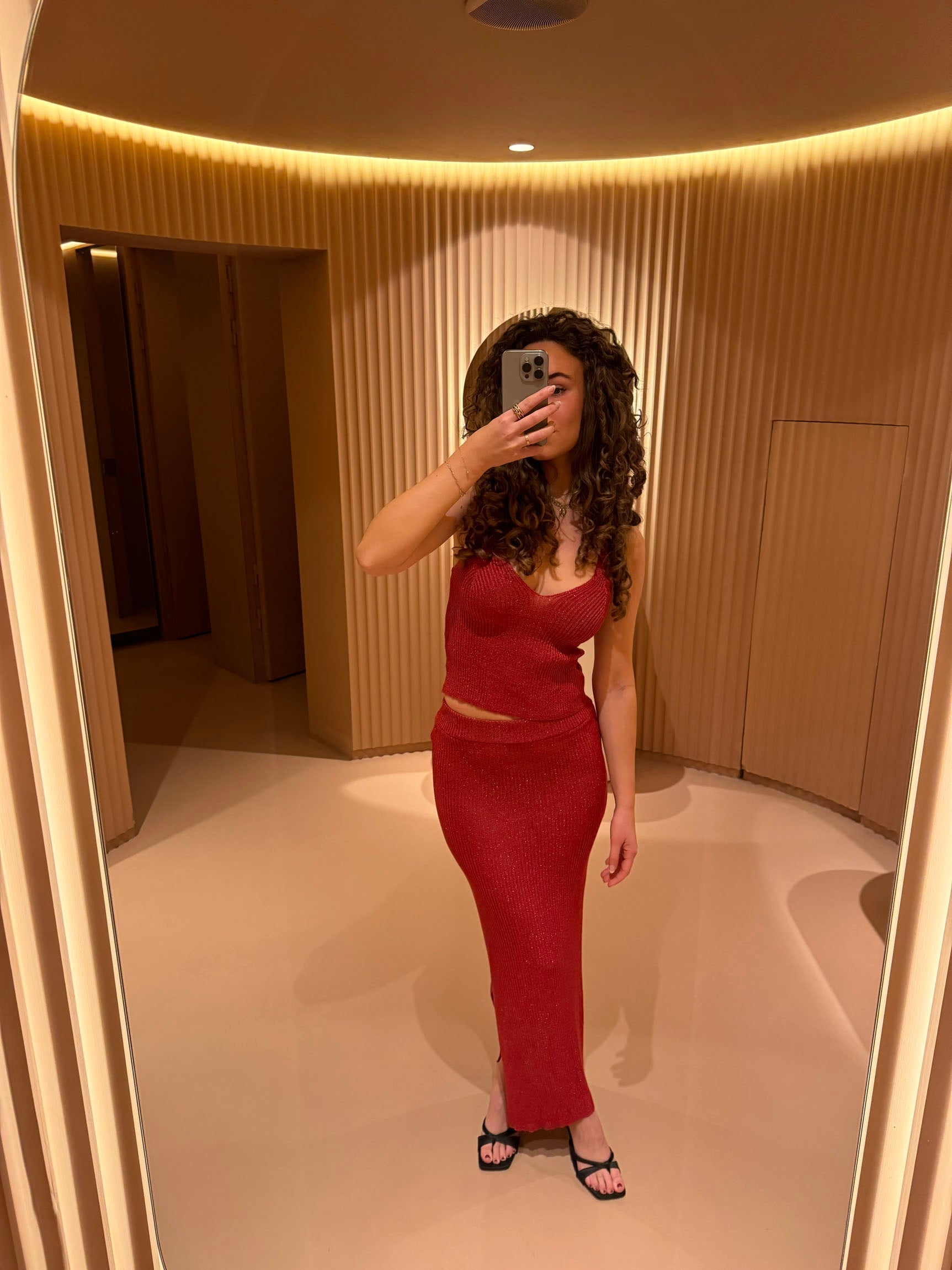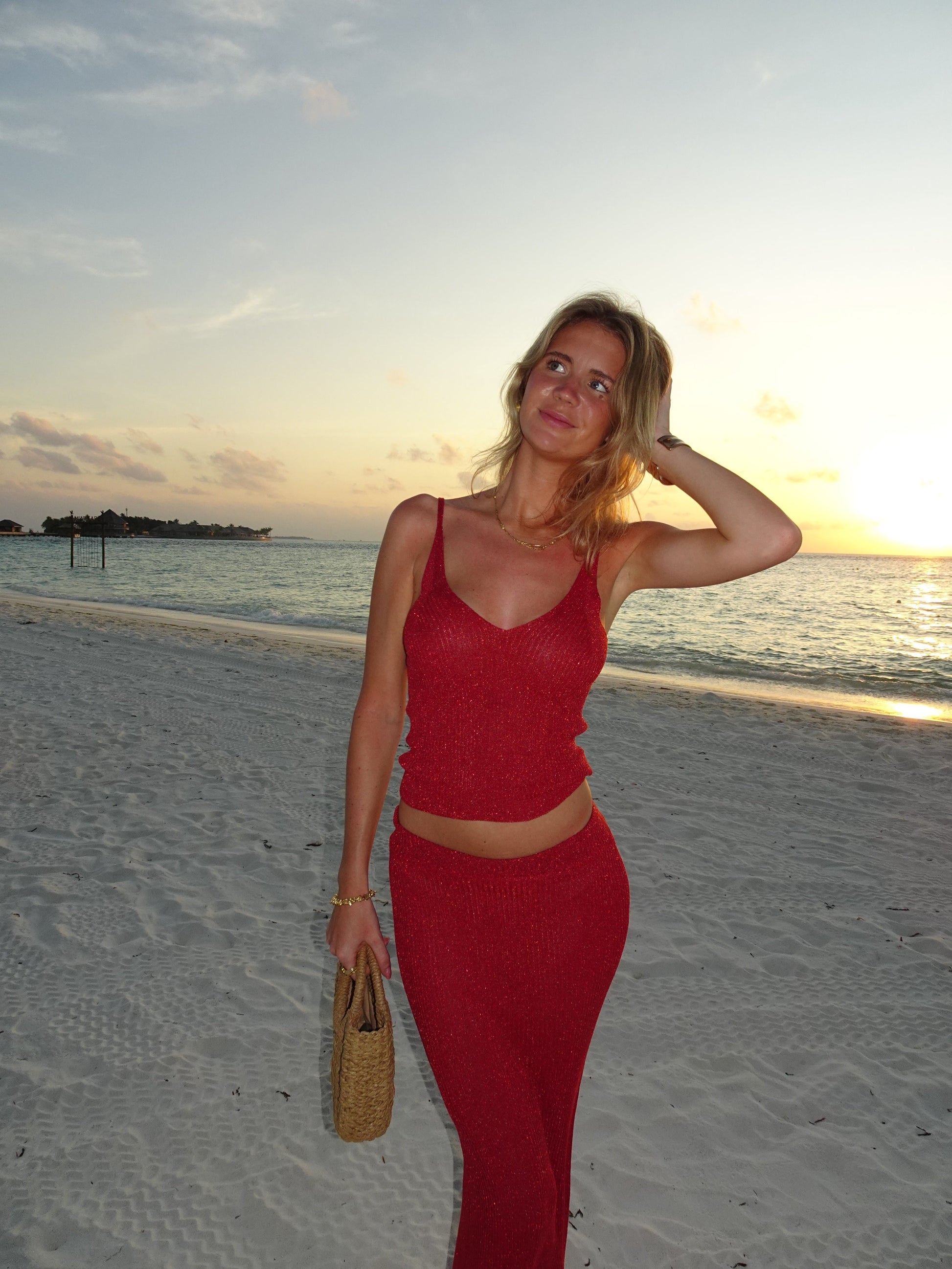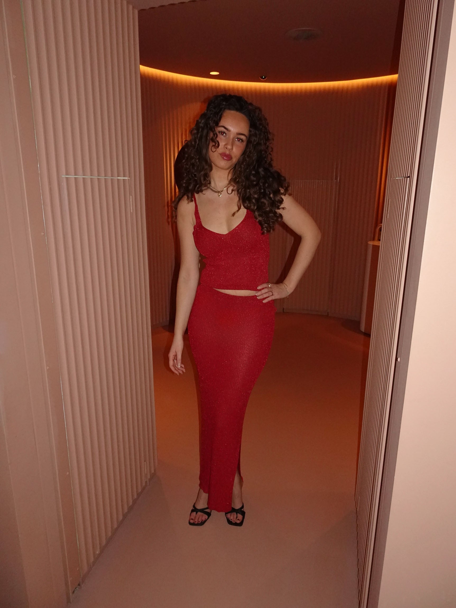 Our red Malie glitter skirt is made from a beautiful and shimmering material. The skirt features a tight fit, giving it a super cool and unique look! It pairs perfectly with our Malie glitter top and is ideal for festive events where you want to shine. This skirt can appear transparent in some light, therefor we recommend underwear in a neutral color.